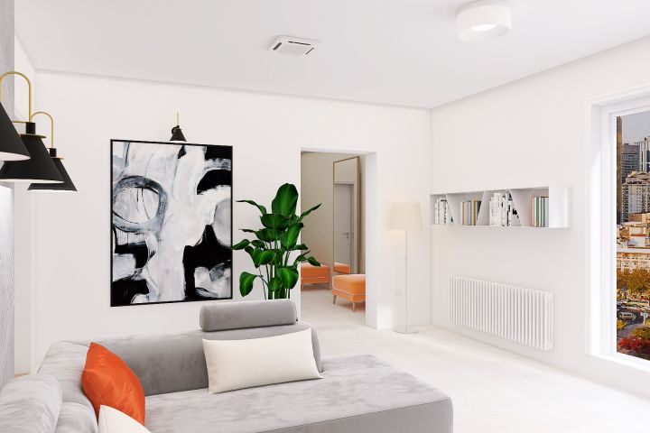Расчет энергетики пространства и личной энергетики всех членов семьи позволил оформить интерьер в стиле усиления стихии металла и почвы, в такой цветовой гамме, как: белый, светло серый, беж, оранж. Ну а в спальню для детей внесли еще и элементы воды — ярко синие тона. Квартира получилась очень светлая, акценты сделали на оранжевом цвете в оформлении некоторых элементов мебели и аксессуаров: кувшины, пуфики для спальни и гардеробной. Получилось много света, пространства, все что необходимо для жизни, комфорта и отдыха. Стилизованный камин и возможность наблюдать вид города из панорамных окон, просторная кухня и балкон, просторная гардеробная зона в прихожей для всей семьи. Просторная детская на двоих с зоной для сна, игр и учебы старшего сына. Вся семья была довольна!