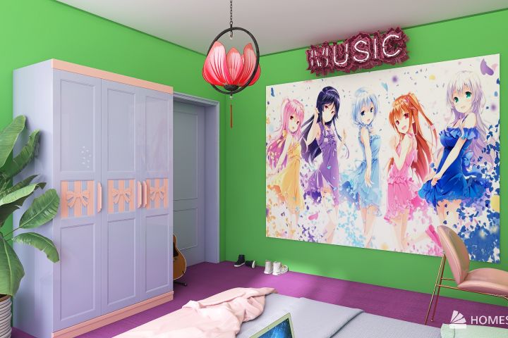Данный дизайн проект был сделан за пару дней. Детская комната для девочки подростка, которая увлекалась аниме, была сделана с учетом того, что все зоны ее комнаты были в благоприятных энергиях, поэтому можно было дать волю фантазии самой хозяйки. После сделанных расчетов энергетики пространства и личности хозяйки комнаты, мы вместе с ней кропотливо подбирали ее любимые цвета и аксессуары. Мебель была сделана на заказ. Пол устлан мягким с длинным ворсом ковролином. Зеленый цвет стен усиливал энергию дерева, которая в данной комнате была самая благоприятная и мощная для поддержания здоровья. Этот же цвет служил и фоном, на котором акцентом выделялась розово-сиреневая мебель. Необычно и гламурно, как и хотела сама хозяйка.
