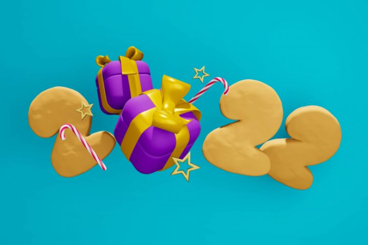 New 2022 Year is coming. Two gifts and gingerbread numbers, candy and golden stars on blue background. 3d illustration on Blender