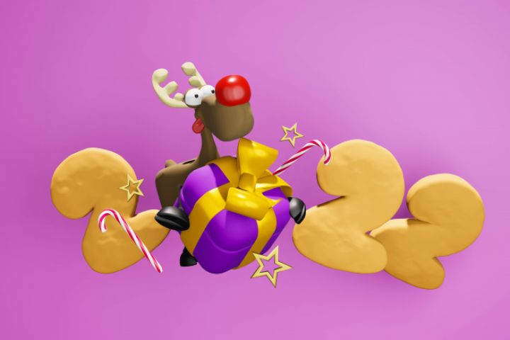 New 2022 Year is coming. Deer with gift and gingerbread numbers, candy and golden stars on pink background. 3d illustration