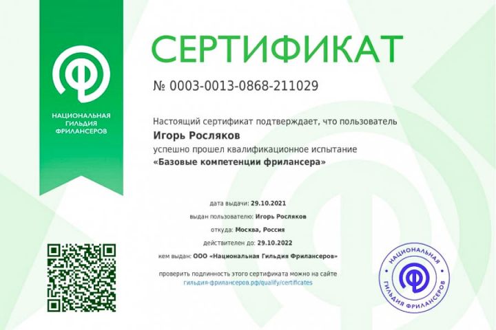 Сертификат "Базовые компетенции фрилансера"