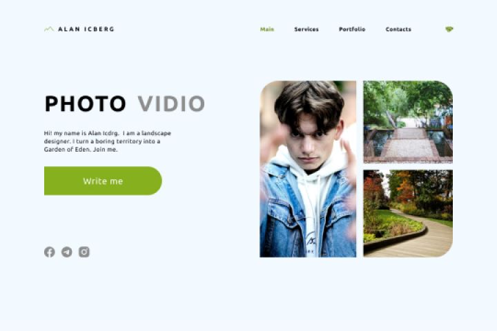 Задача: Разработать дизайн сайта портфолио. ------------------------------------------------------------------------- Примечание: Основные цвета сайта: белый, салатовый.
