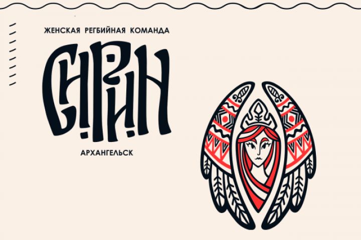 Концепт логотипа, эмблемы и фирменного стиля для женской регбийной команды "Сирин" (г. Архангельск), оформленных в духе традиционной серверной росписи