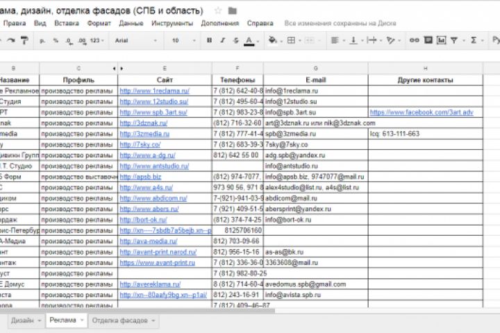 Был произведен поиск и сбор контактов рекламно-производственных, дизайнерских компаний и фирм, которые занимаются отделкой фасадов зданий.