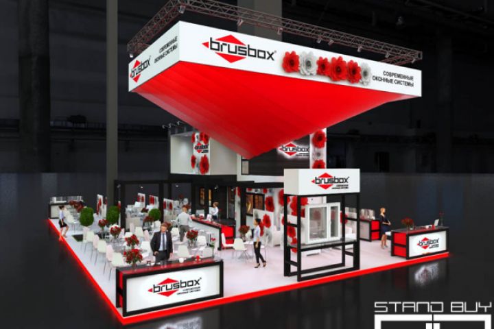 Компания «БРУСБОКС» – один из крупнейших производителей ПВХ профиля и подоконной доски в России, основана в марте 2004 года. BRUSBOX – это принципиально новая разработка — качественный профиль ПВХ, созданный в России и для России на основе уникального комплекса передовых технологий и собственного практического опыта производства металлопластиковых окон. На сегодняшний день производственная база компании «БРУСБОКС» расположена в г. Брянске и составляет 50000 м2, площадь производственных помещений – 10000 м2, 28 экструзионных линий фирмы KraussMaffei Technologies GmbH. Для производства ПВХ профиля и подоконника используется сырье ведущих мировых производителей. Проект выставочного стенда представляет собой строгую геометрическую объемно-пространственную композицию. Согласно пожеланию заказчика, фасады стилизованы современный коттедж. К центральному входу ведет дорожка из деревянного настила с элементами озеленения по бокам. Также нами были применены крупные бумажные цветы красного и белого цвета для декорирования крупных объемов и подвесной конструкции. Общее стилевое решение можно охарактеризовать как конструктивизм с элементами хай-тека. Металлические конструкции выкрашены в черный цвет. Основные цвета фирменного стиля компании — белый, красный, черный. Весь стенд оформлен в строгом соответствии с корпоративными колористическим решением. Закрытые зоны представляют собой складские помещения и кухню.