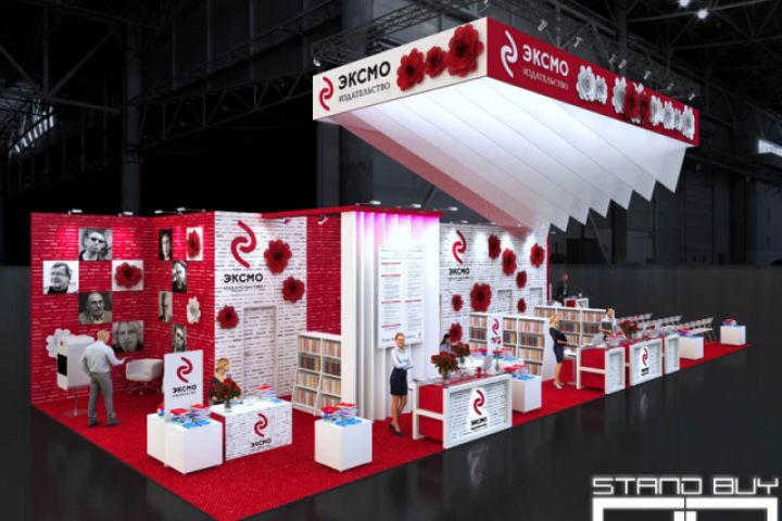 Выставочный стенд компании «Эксмо», как, безусловно, крупнейшего сегодня издательства «Эксмо» в России, задумывался нами в очень необычном ключе. Прежде всего необходим был масштаб — и он передан за счет крупного формообразования. Во-вторых — важно было передать образность, книг, страниц, процесса перелистывания. С этой целью нашими архитекторами была спроектирована подвесная конструкция, призванная вызвать у посетителя выставки ассоциацию с гигантскими раскрытыми страницами по самым потолком павильона. Согласитесь, что может быть более завораживающим? Работая над проектом их выставочного стенда мы максимально подчеркнули книжную направленность деятельности — здесь и стеллажи с образцами продукции, и стены, оформленные различными шрифтами, и надписи, обозначающие различные слили и обозначения в современной литературе. Естественно, цветовая гамма сооружения выполнена в строгом соответствии с фирменными цветами компании. Верхние углы конструкции оформлены при помощи воздушных шаров, так как по требованиям организаторов выставки максимальные высотные отметки стендовых конструкций имеют ограничения, причем весьма скромные по выставочным меркам. В целом же проект получился довольно ярким, запоминающимся, и, что так же немаловажно — очень функциональным с точки зрения представляемой посетителю книжной продукции. Естественно, при проектировании мы учли абсолютно все технические требования заказчика — здесь есть и зона для выступления авторов, оснащенная всем необходимым оборудованием (для довольно сложной акустической комнаты предусмотрено отдельное помещение, на случай возникновения срочных ремонтных или наладочных работ), зоны продаж, с местами для авторов, раздающих поклонникам автографы, три комфортные переговорные комнаты. А также отдельная фотозона — с портретами знаменитых писателей наших дней.