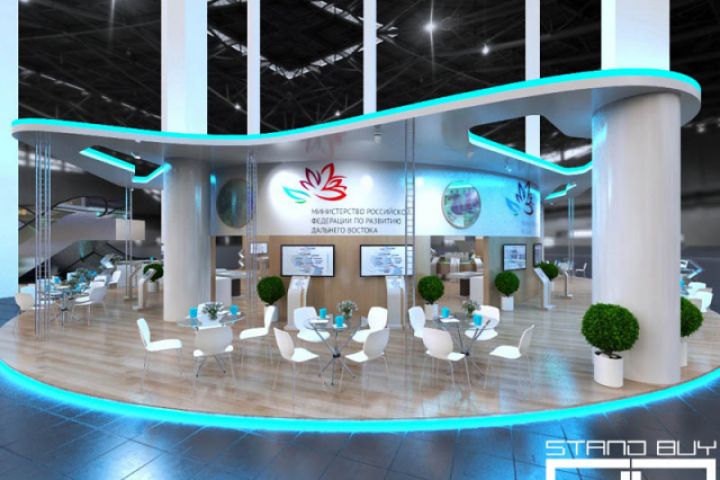 Выставочная экспозиция Большого Министерства на Восточном Экономическом Форуме разработана нашими специалистами в футуристическом ключе. Высокотехнологичные приемы здесь сочетаются с плавными бионическими линиями. Большое кличество светодиодных подсветок придают экспозиции футуристический образ, напоминающий декорации к фантастическому фильму. Основной участок, отведенный под застройку, имеет круглую форму, что и подсказало нам саму концептуальную идею. Второй, дополнительный участок расположен рядом и имеет существенно меньшую площадь. В плане он имеет форму сегмента круга. Нам удалось увязать обе постройки в единый ансамбль, создав целостную объемно-пространственную композицию.