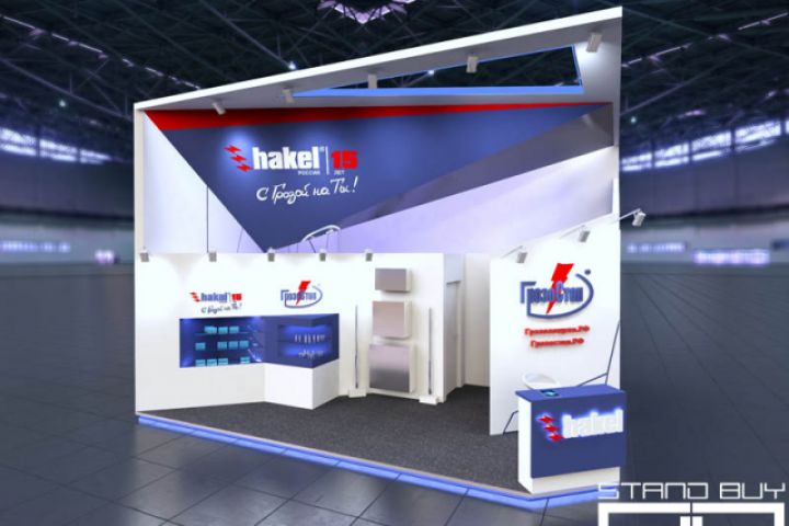 Компания АО «Хакель Рос» основана в 2002 году в Санкт-Петербурге как совместное с компанией HAKEL (Чехия) российско-чешское предприятие, являющееся официальным представительством и эксклюзивным дистрибьютором компании HAKEL в России и странах СНГ. В настоящее время АО «Хакель Рос» является предприятием со 100% российским участием. В 2007 году на базе АО «Хакель Рос» организовано и запущено производство щитков защиты от импульсных перенапряжений низковольтных комплектных – ЩЗИП®, выпускаемых по ТУ 3434-001-79740390-2007. Этот продукт был разработан по техническим заданиям российских потребителей, в результате накопленных технических знаний и решений в области грозозащиты и защиты от импульсных перенапряжений. Данный проект выставочного стенда разработан нами для компании «Хакель Рос» представляет собой объемно-пространственной решение в стиле деконструктивизм. Мы намерено отказались от «правильных» геометрических форм в пользу угловых и диагональных методов построения. Основные цвета фирменного стиля компании — белый и темно-синий. Одним из пожеланий заказчика было сделать двери в переговорную и подсобное помещение максимально незаметными с фасада. Нами было предложено планировочное решение, предусматривающее нишу, из которой уже вправо и влево ведут две двери. Тем самым они практически не видны. Напольное покрытие — ковролин. Основные материалы — ЛДСП, конструктор Maxima с баннером. Закрытые зоны представляют собой просторную переговорную, подсобное помещение для персонала, и складское помещение для хранения рекламной продукции.