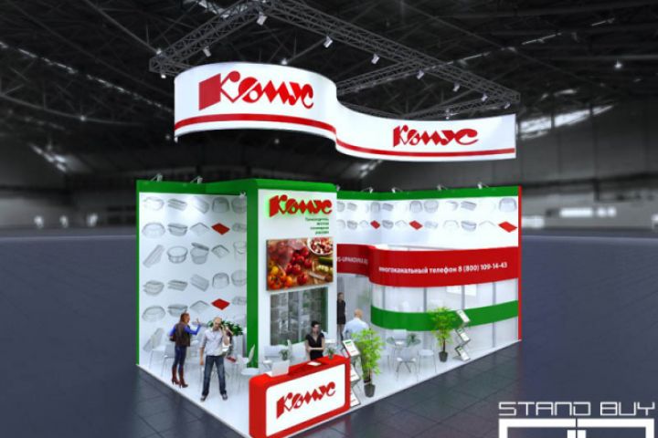 Проект выставочного стенда компании «Одинцовская фабрика «КОМУС-упаковка» представляет собой геометрическую композицию с применением плавных скругленных линий. Мы исходили прежде всего из пожеланий заказчика, который посчитал такое формообразование наиболее эффектным для представления компании на выставке «RosUpack 2017”. Мы усложнили круглую форму при помощи нескольких радиусов, переходящих один в другой и составляющих общую динамичную структуру планировки и фасада. Также мы разработали подвесную конструкцию над пространством стенда, представляющую собой изогнутую по двум радиусам плоскость, на которую с обех сторон нанесены логотипы компании. Такая композиция при правильном освещении создает интересный визуальный эффект при обзоре с разных точек. Цветовое решение строго соответствует фирменному стилю компании. Основные материалы — ЛДСП, конструктор Maxima с баннером, оргстекло.