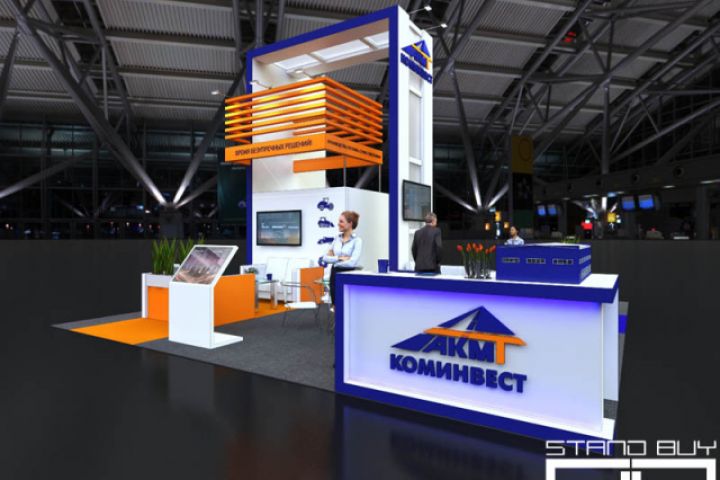 АО «Коминвест-АКМТ», основанное в 1992 г. и является одним из крупнейших российских машиностроительных предприятий. Основные направления его деятельности — производство, комплексные поставки, сервисное обслуживание спецтехники и оборудования. Проектируя выставочный стенд для этого, без преувеличения, гиганта отечественной промышленности, мы видели в качестве основной своей задачей создание некоего мощного монументального образа. Если угодно — скульптурной доминанты. При кажущейся простоте, этот стенд весьма не прост. Здесь поработали профессиональные архитекторы, поэтому планировочная структура близка к идеальной. Цветовое решение выполнено в рамках фирменного стиля, и распределено таким образом по общему объему, что соотношение цветовых акцентов идеально сбалансировано. Напольное покрытие — ковролин. Основные материалы — ЛДСП, конструктор Maxima с баннером.