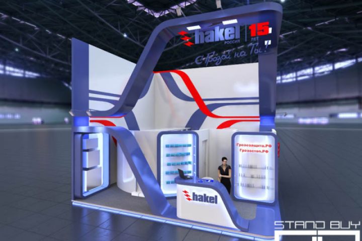 Выставочный стенд компании «Хакель Рос», специализирующейся в области производства систем громоотвода, разработан нами для выставки «Нефть и газ 2017». Проект представляет собой объемно-пространственной решение в современном стиле с небольшим применением бионических форм. Мы намерено отказались от «правильных» геометрических форм в пользу плавных линий и скругленных углов. Основные цвета фирменного стиля компании — белый и темно-синий. Одним из пожеланий заказчика было сделать двери в переговорную и подсобное помещение максимально незаметными с фасада. Нами было предложено планировочное решение, предусматривающее нишу, из которой уже вправо и влево ведут две двери. Тем самым они практически не видны. Напольное покрытие — ковролин. Основные материалы — ЛДСП, конструктор Maxima с баннером. Закрытые зоны представляют собой просторную переговорную, подсобное помещение для персонала, и складское помещение для хранения рекламной продукции.