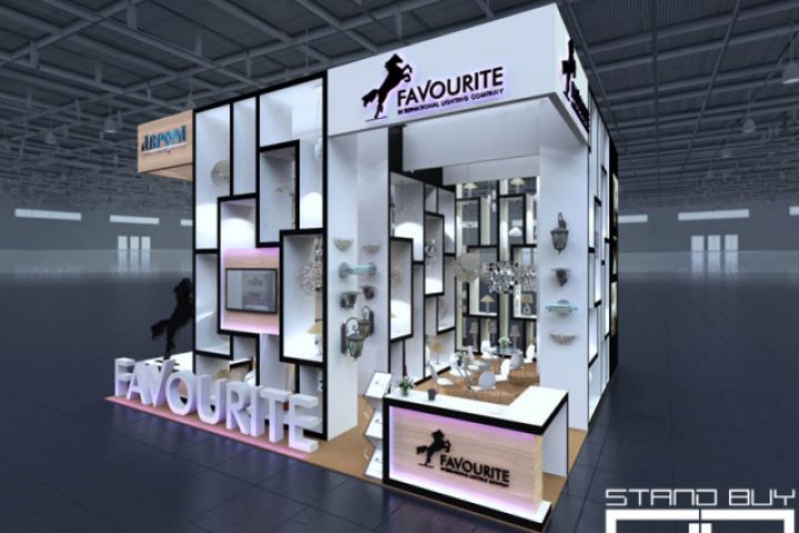 Так как компания Favourite представляет на своем стенде довольно большое количество осветительных приборов в совершенно различных стилевых направлениях а также изготовленных из совершенно разным материалов, нами было принято решение о создании некой целостной структурной композиции разделенной на секции, но являющейся при этом все же цельным архитектурным элементом. Так и появился этот образ полупрозрачного и светящегося куба, ориентированного в пространстве абсолютно на все стороны зала. Интерьер же, в свою очередь, предлагает посетителю выставки совершить увлекательнейшую экскурсию в мир света, стекла, гармонии, роскоши.