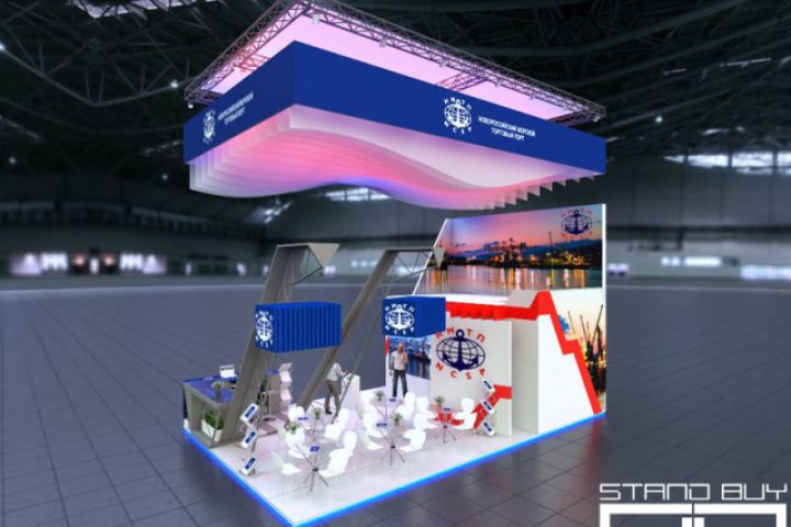 Выставочный стенд Новороссийского морского торгового порта разработан нами в двух вариантах. По нашему мнению, наиболее характерная часть порта — погрузочные краны, так как их видно почти из любой точки города. Следовательно, именно вертикальные стрелы кранов способны наиболее наглядно передать образ. Мы создали имитацию кранов при помощи сварной металлической конструкции, имеющей жесткую структуру фермы и крепление к подиуму. Для завершения образа на кране подвешены декоративные контейнеры с логотипом новороссийского порта. Во втором варианте мы применили решили следовать фирменному стилю компании, и вместо желтого цвета применили красный. Стрелы погрузочных кранов выкрасили в серый цвет. Так как на заднем плане мы разместили фотопечать с вечерним видом новороссийского порта, подсветку подвесной конструкции осветили цветами неба на закате. Планировочное решение несколько изменено относительно первого варианта. Прежде всего мы спрятали входные двери в переговорную и подсобное помещение, расположив перед ними стену с логотипом. Основные материалы — ЛДСП, конструктор Maxima с баннером.