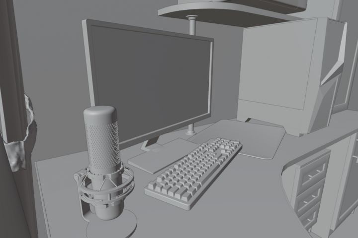 Смоделированная, затекстуренная с нуля полностью мной комната (рабочее место) в Blender. Высокая проработка мелких деталей.