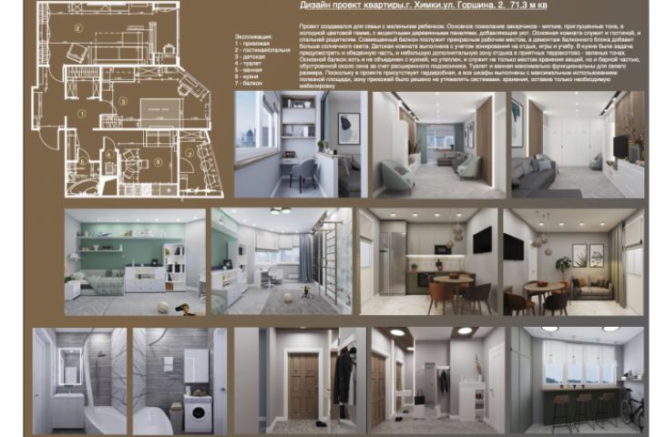 Проект создавался для семьи с маленьким ребенком. Основное пожелание заказчиков - мягкие, приглушенные тона, в холодной цветовой гамме, с акцентными деревянными панелями, добавляющие уют. Основная комната служит и гостиной, и спальней родителям. Совмещенный балкон послужит прекрасным рабочим местом, а демонтаж балконного блока добавит больше солнечного света. Детская комната выполнена с учетом зонирования на отдых, игры и учебу. В кухне была задача предусмотреть и обеденную часть, и небольшую дополнительную зону отдыха в приятных терракотово - зеленых тонах. Основной балкон хоть и не объединен с кухней, но утеплен, и служит не только местом хранения вещей, но и барной частью, обустроенной около окна за счет расширенного подоконника. Туалет и ванная максимально функциональны для своего размера. Поскольку в проекте присутствует гардеробная, а все шкафы выполнены с максимальным использованием полезной площади, зону прихожей было решено не утяжелять системами. хранения, оставив только необходимую мебелировку.