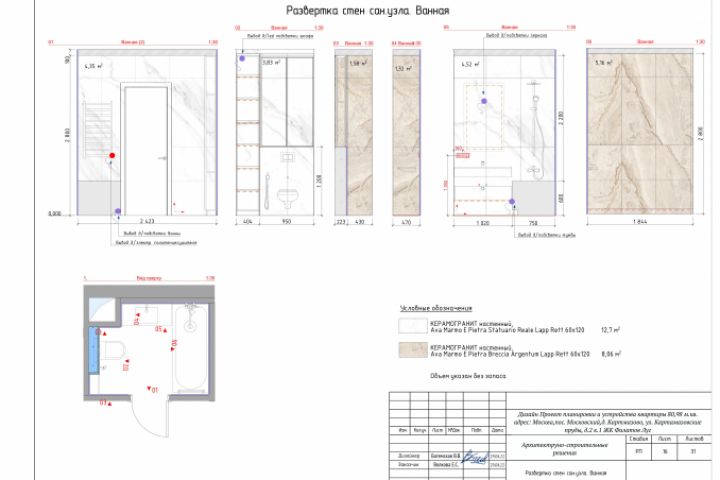 Развёртки стен сан узла из рабочей документации квартиры в ЖК Филатов Луг