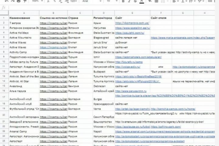 Найти сайты организаторов и сайты проведения детских соревнований, лагерей детских баз. С занесением информации в Exel