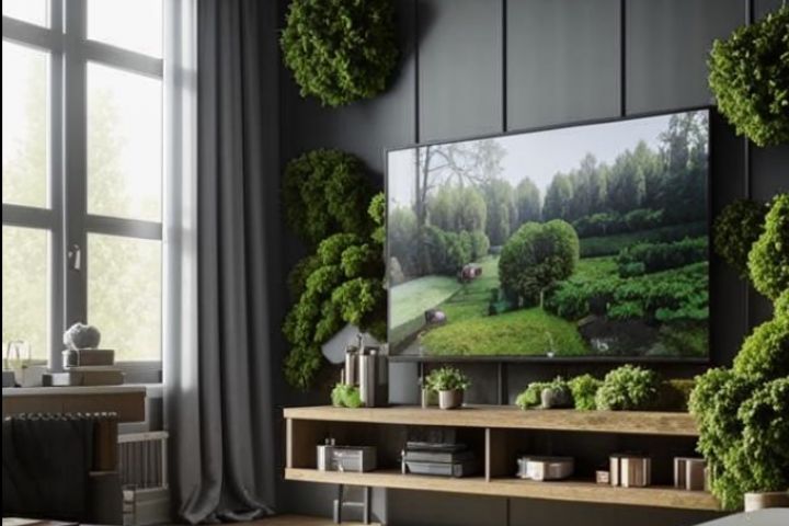 Создать дизайн гостинной в серых тонах, одна стена из мха, вторая из ламината, диван, на стене телевизор, панорамные окна, Стиль: Эко-лофт