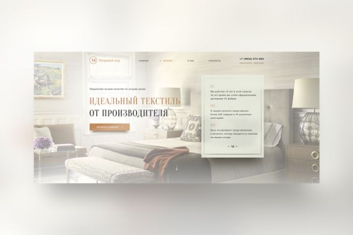 При разработке дизайна учтены основные задачи сайта выгодно представить компанию с помощью интернет сайта и разработать удобный и быстрый каталог для продукции. Дизайн выполнен с учетом сферы деятельности компании в текстильной отрасли, цвета мягкие, пастэльные, CTA элементы выполнены в общей цветовой гамме но при этом хорошо видны и понятны, концепция дизайна ровная и спокойная.