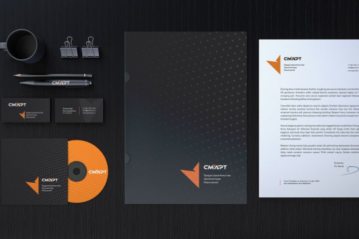 Фирменный стиль для компании "СМАРТ" из Санкт-Петербурга, оказывающей услуги в области градостроительного, архитектурного, инженерного проектирования и инженерных изысканий.