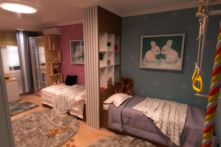 Комната условно разделена на 2 части. Каждая часть имеет свой цвет. Перегородка выполнена из массива дерева. Шкаф крашеный мдф. Вся мебель изготовлена по индивидуальным размерам на нашей фабрике.