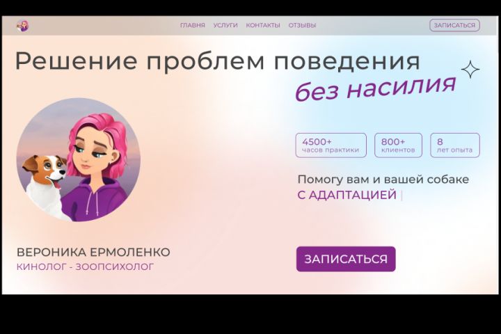 Легкий и яркий сайт для зоопсихолога, который показывает какие услуги можно выбрать. Подчеркивая экспертность специалиста блоками о себе и отзывами. Легко сделать целевое действие( записаться на консультацию).
