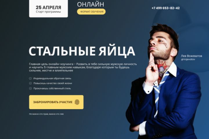 Дизайн первого экрана лендинга к запуску тренинга Льва Вожеватова