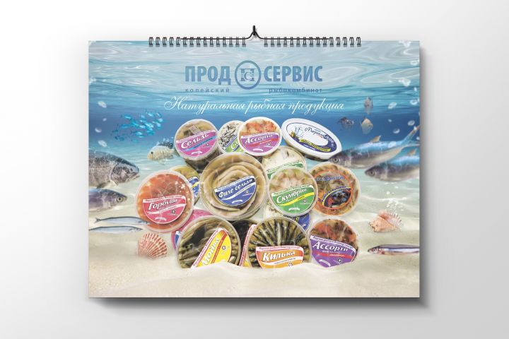 Задача была сделать календарь из присланной картинки продукции. Компания занимается изготовлением рыбных консервов. За основу идеи я взяла "натуральность" продукта, показав, что рыба свежая и буквально только что плавала в море.