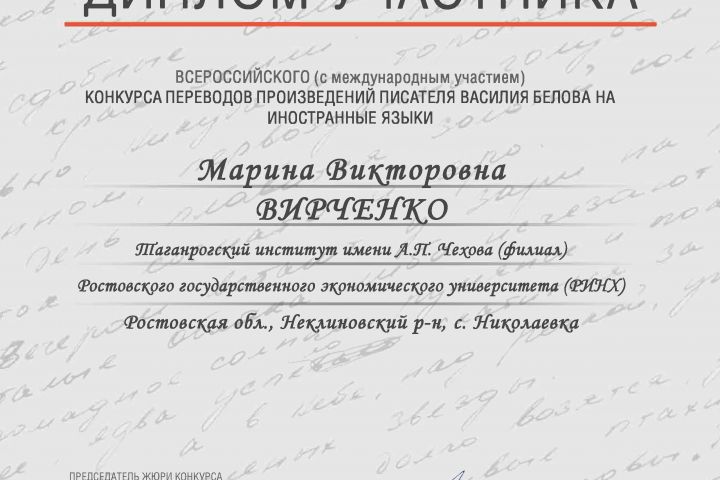 ФГБУК «Кирилло-Белозерский историко-архитектурный и художественный музей-заповедник», Филиал «Музей-квартира В.И. Белова» провели конкурс переводов произведений писателя В.И. Белова на иностранные языки. Приняла участие, перевела отрывок произведения "Иду домой" с русского на французский язык.
