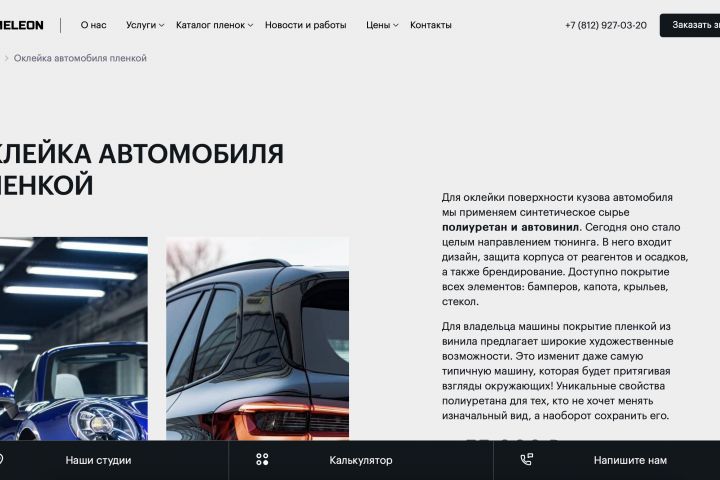 Несколько лет я занимался сопровождением интернет-каталога детейлинг-центра "CHAMELEON". Сопровождение включало в себя поддержание текущей верстки, а также создание новых элементов, секций, внедрение виджетов (Яндекс, jivo).