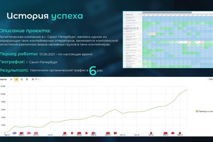 Компания на сегодняшний день является одним из лидеров перевозок наливных грузов в танк-контейнерах. За время работы (3 года) увеличили органический трафик в 6 раз