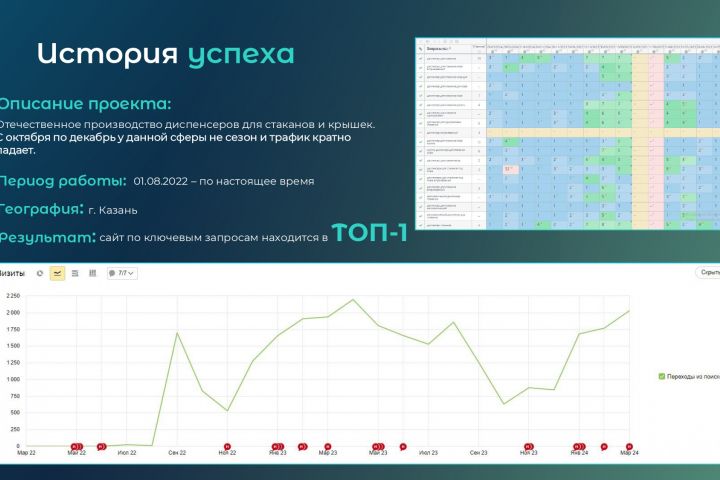 Отечественно производство диспенсеров стаканов и крышек. С октября по декабрь в данной сфере не сезон, и трафик кратно падает. По ключевым запросам сайт находится в Топ-1