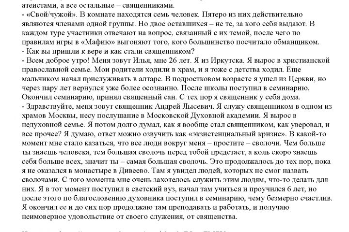 Это пример транскрибации шоу. Сложность повышенная, т.к. присутствует естественная речь (не по написанному заранее сценарию, не профессиональный актер, а обычный человек, священник). Речь слегка отредактирована, чтобы хорошо читалась. По запросу могу писать, как есть, но читать такой текст будет труднее. Разбивка реплик и орфография и стиль обработаны по стандартам отдела субтитров Первого канала.