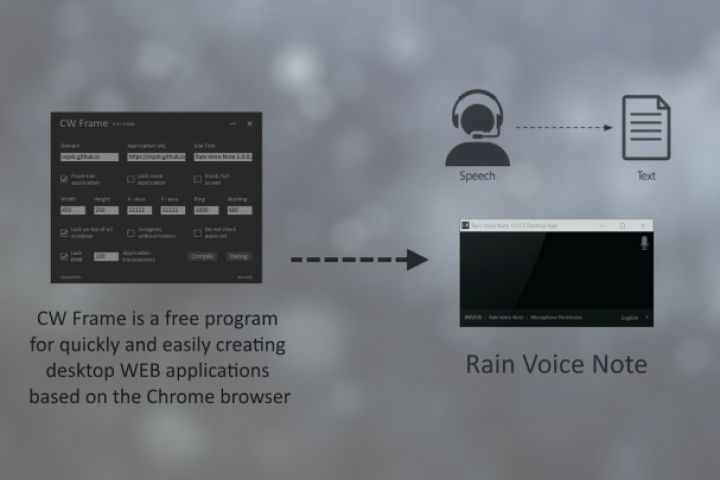 CW Frame формирует окно из самого браузера Chrome, основными преимуществами этого подхода являются небольшой размер приложения (4500 КБ), возможность использовать Google API без ключа API Google (например, распознавание голоса), возможность создать приложение практически с любого сайта.
