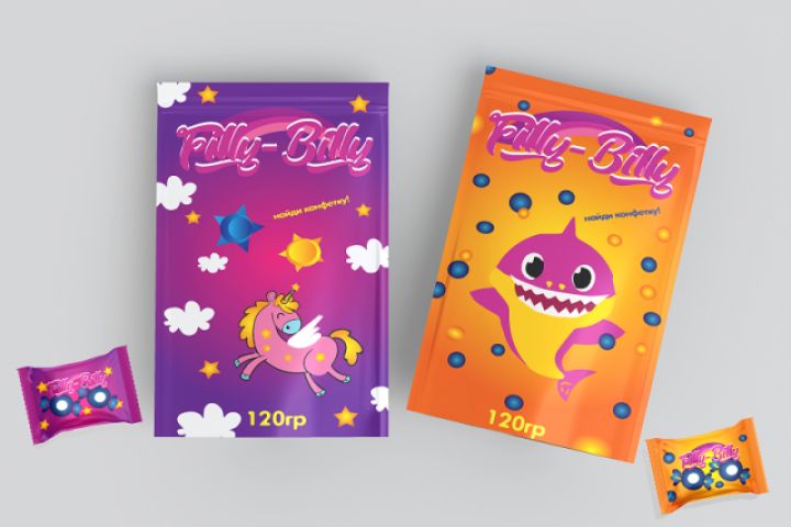 Разработка дизайна детской продукции, конфет Filly-Billy. Так как яркие цвета вызывают аппетит и хорошее настроение, а также маленькие покупатели еще и обращают внимание на яркую, сочную упаковку. Разработанный логотип идеально вписывается в концепцию продукта и упаковки.