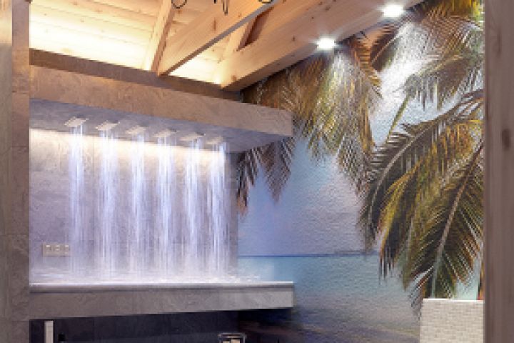 Виз интерьера сауны с бассейном и горизонтальным душем