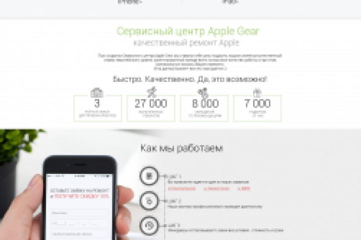 Посадочная страница для сервиса техники Apple в Москве. Клиентом было предоставлено техническое задание с описаниями блоков и пожелания по цветовой гамме сайта. Все выполнено с учетом пожеланий клиента и мною предложен вариант оформления