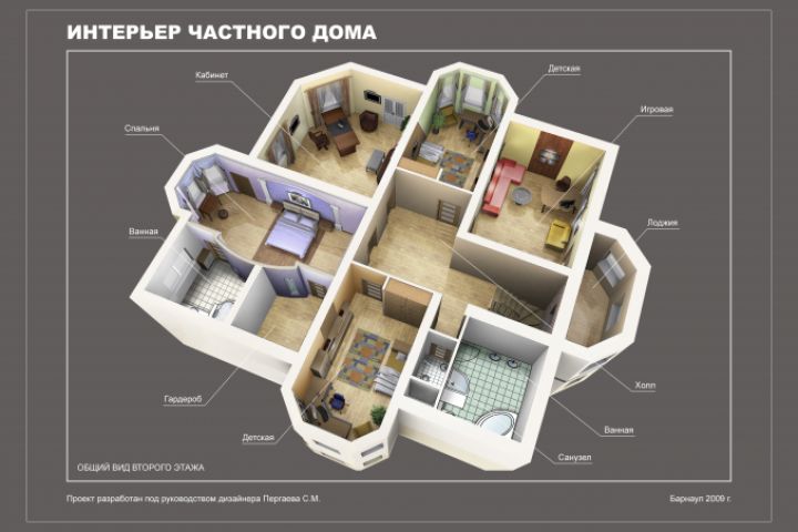 Общий вид 2-го этажа частного дома. Выполнено по материалам дизайнера.