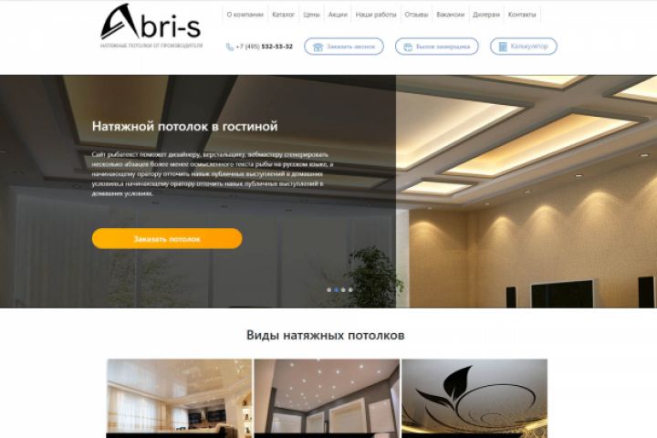 Адаптивная кроссбраузерная верстка главной страницы со слайдерами и анимацией. Сайт компании Abri-s. Занимается натяжными потолками. Сроки выполнения - 1 день.