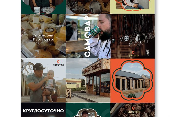 Оформила ленту постов под готовые темы для обновленного туристического кластера Сростки. Использовала фирменные элементы и логотип.