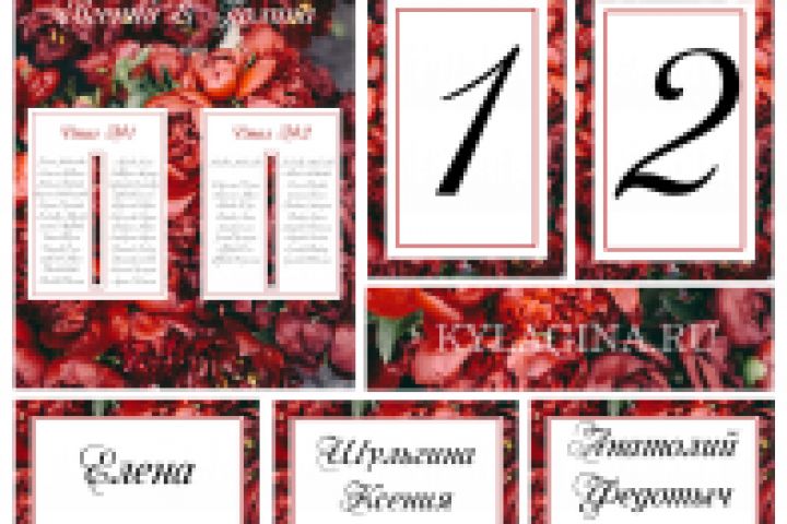 схема рассадки, карточки для всех гостей, номерки на столы. в цветовом стиле марсала