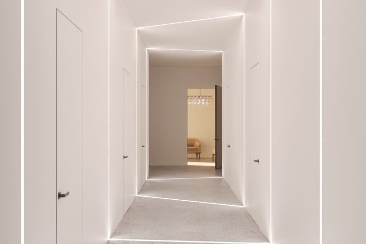 Узкий и длинный коридор при применении правильных приемов становится просторным и сияющим символизируя дорогу к чему-то новому и светлому.