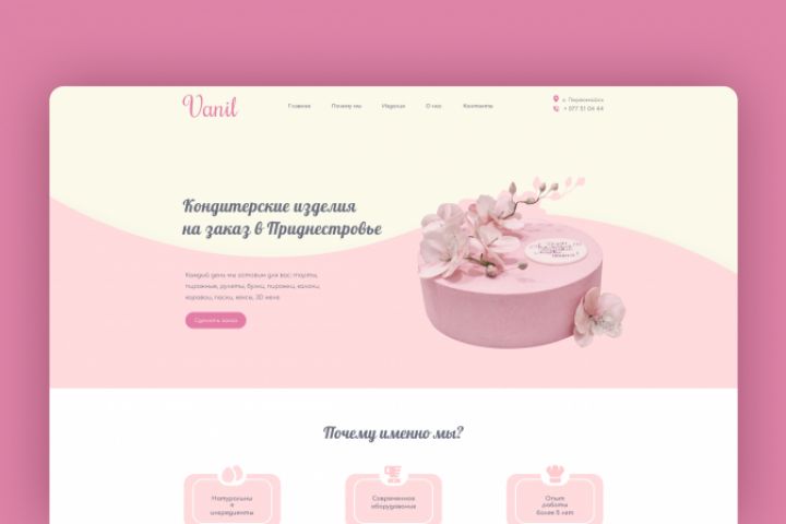 Лендинг для домашней пекарни. Целевая аудитория - женщины 25-55 лет. Исходя из ЦА были для оформления выбраны теплые пастельные оттенки. Поскольку тема сайта - мягкая сладкая выпечка подобраны округлые мягкие шрифты