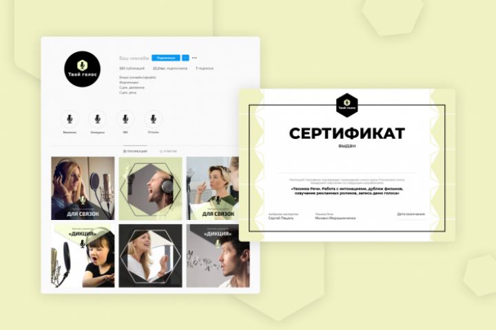 Задача: оформление постов инстаграм для студии ораторского мастерства и вокала в неярких тонах. Разработка дизайна сертификата об окончании курсов
