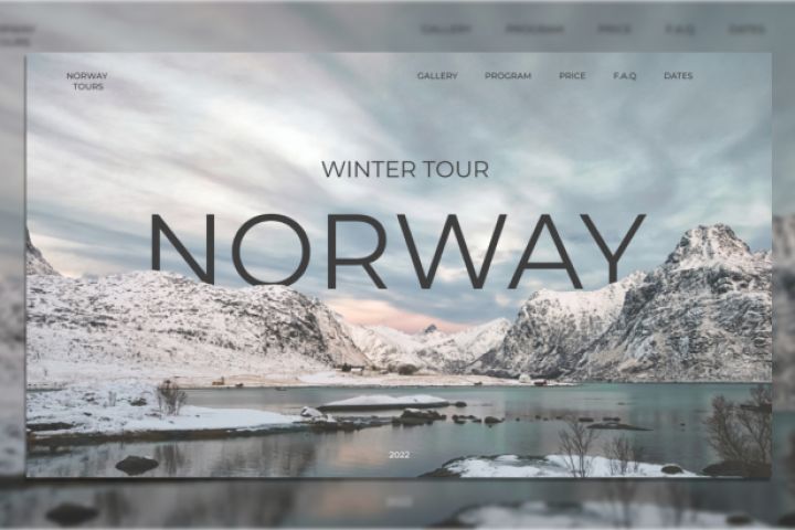 Первый экран для страницы зимнего тура по Норвегии, страница представляет все детали, программу и небольшие советы по туру, состоит в основном из фотографий и небольших текстов. Главная задача: передать атмосферу тура и рассказать основные моменты + перевести на форму заказа
