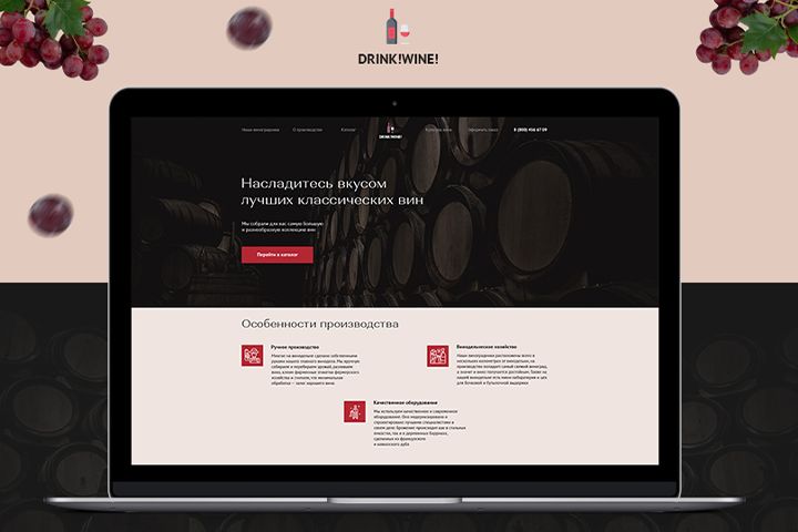 Данный лэндинг был создан для винодельни. Заказчик просил не делать в стандартных темных тонах и разбавить общую картинку светлыми цветами.