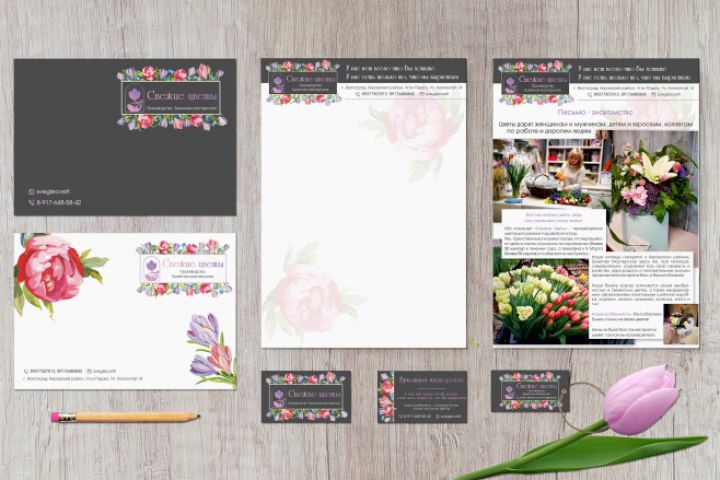 Фирменный стиль для букетной мастерской при теплицах Свежие цветы. Изначально заказчик просил разработать фирменный стиль с имеющимся логотипом, но в процессе работы было решено логотип тоже обновить. Сейчас практически все варианты печатной продукции разработаны в данном стиле, а далее приступим с редактированию цифрового дизайна (групп в социальных сетях, сайта)
