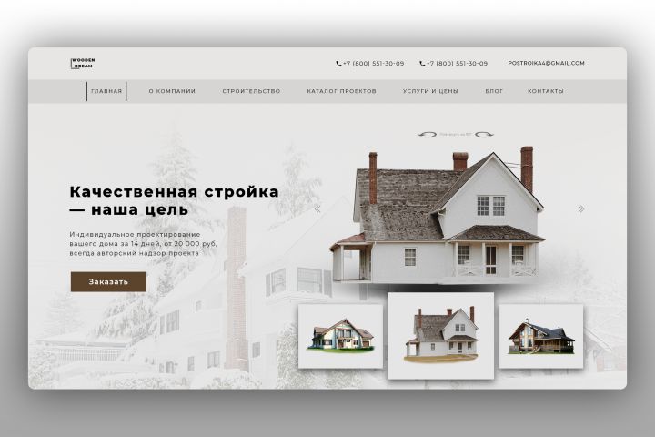 Первый экран Landing page для комани "Wooden Dream", которая занимается постройкой домов.