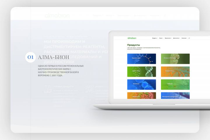 Разработка многостраничного сайта-каталога для производителя и дистрибутора реагентов, расходных материалов и услуг для био-исследований и диагностики. Посмотреть в портфолио: https://mareli-design.ru/almabion/
