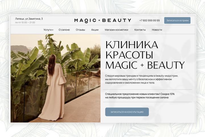 Многостраничный сайт для клиники красоты в г. Липецке Magic+Beauty. Ссылка на сайт — https://magicbeauty.pro/